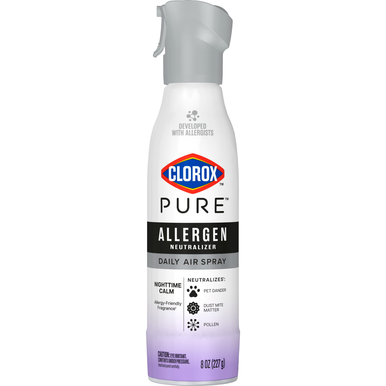 Clorox PURE Allergen Neutralizer Daily Air Spray neutralizes pet dander, dust mite matter and pollen while freshening with allergen free fragrance.