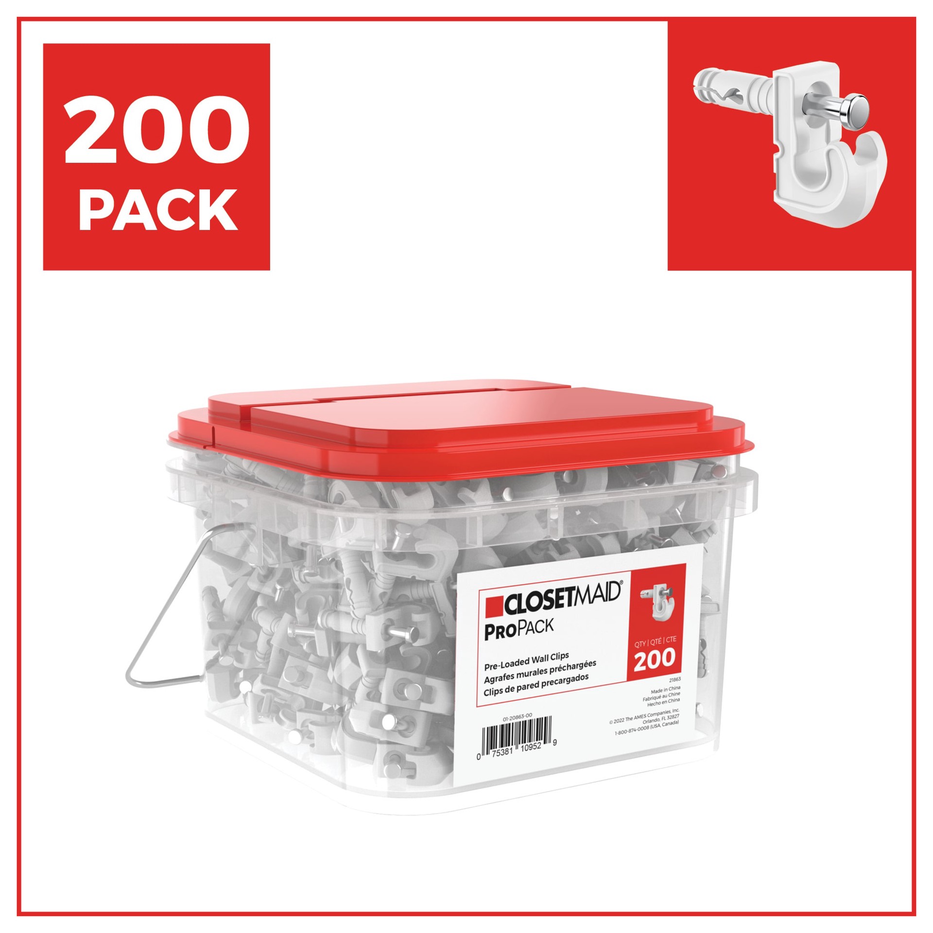 Package includes 200 wall clips with anchors and pins. For drywall installation. Works with all ClosetMaid® wire shelving types. Use 1 clip at least every 12-in and at each end of shelf. Clip is pre-l…
