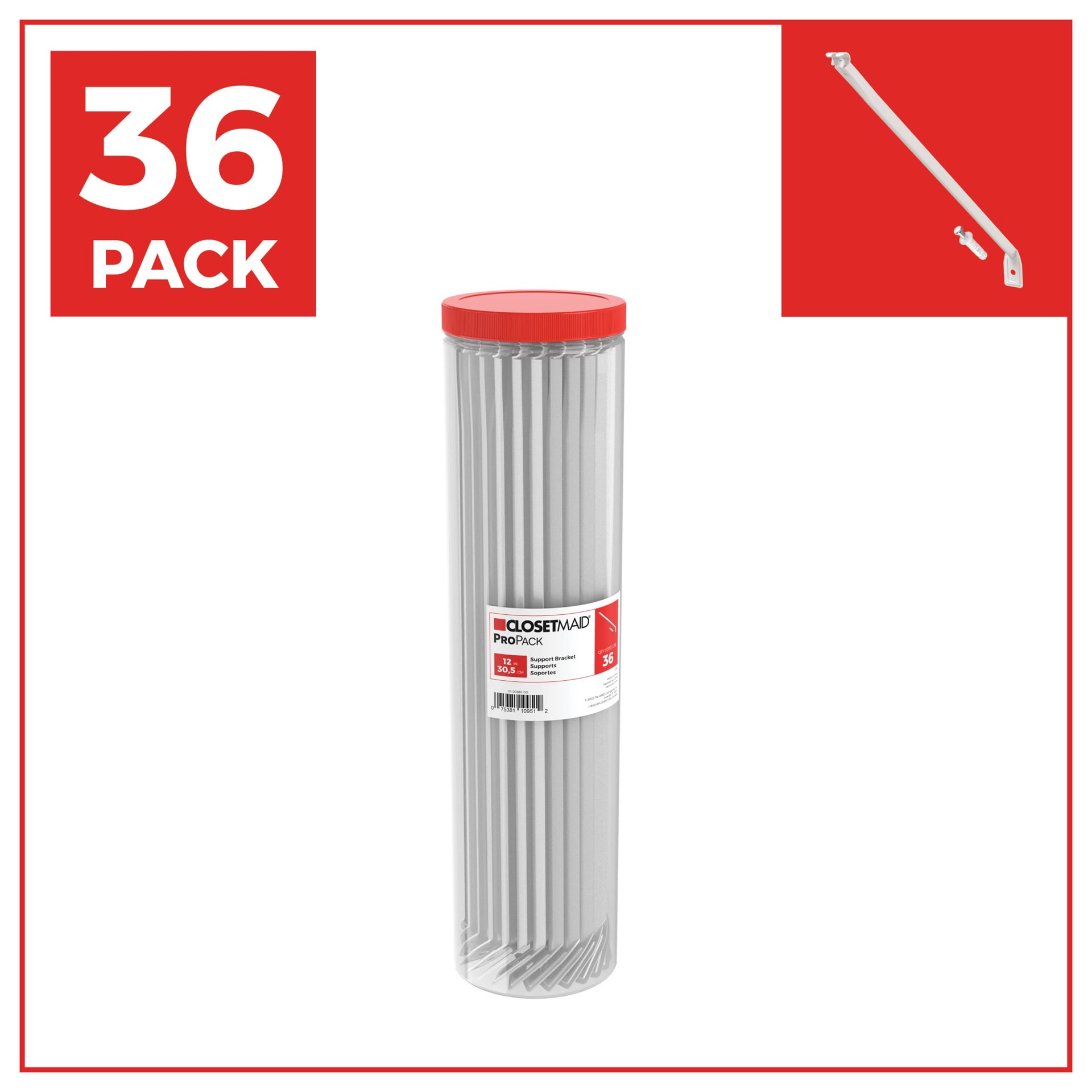 Works with all 12-in wire shelving and 16-in Shelf and Rod. One package contains 36 brackets, 36 pre-loaded anchors with pins. Steel construction. Installation hardware included. White epoxy finish.