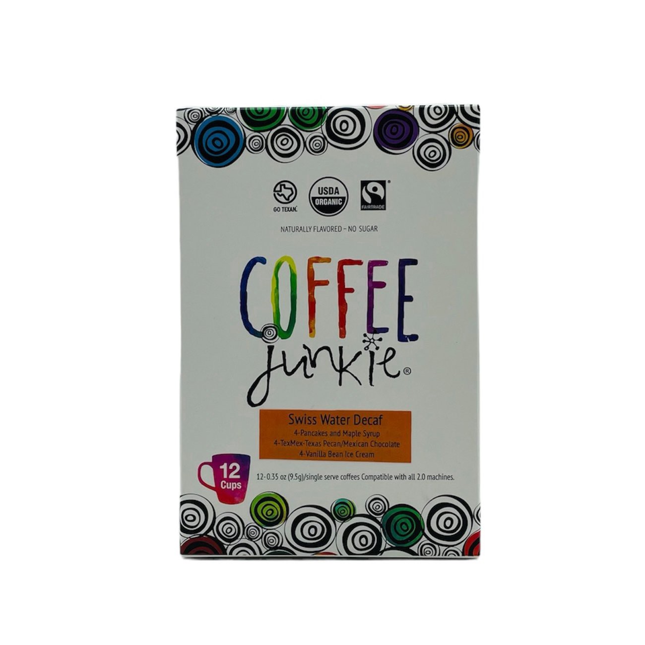 12- 3 Flavor Single Serve Cups-DECAF Enjoy the 3 most popular DECAF Coffee Junkie Coffees in one box. 4- Vanilla Bean Ice Cream Decaf Cups 4- Pancakes and Maple Syrup Decaf Cups 4- TexMex (Texas Pecan…