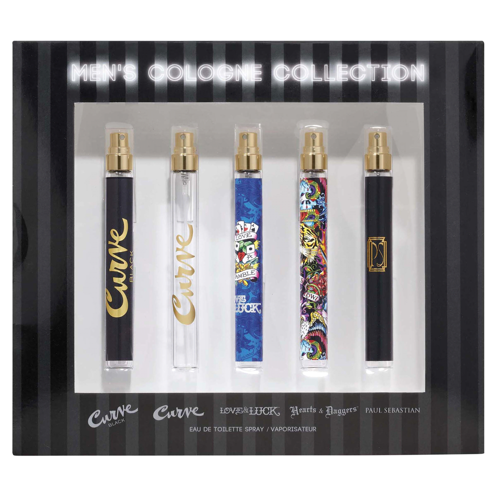 This cologne collection for Men contains Curve Black, Curve, Love & Luck, Hearts & Daggers and Paul Sebastian. Each spray pen contains 0.33 ounces.