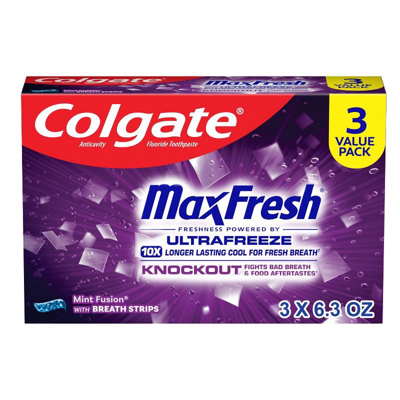 - Includes three (3) 6.3 oz tubes of Colgate MaxFresh Knockout Mint Toothpaste