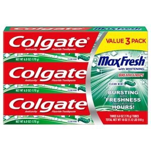 You can breathe confidently with Colgate Max Fresh Toothpaste with Breath Strips and a great Clean Mint flavor. Our unique toothpaste formula is packed with hundreds of mini breath strips and unleashe…