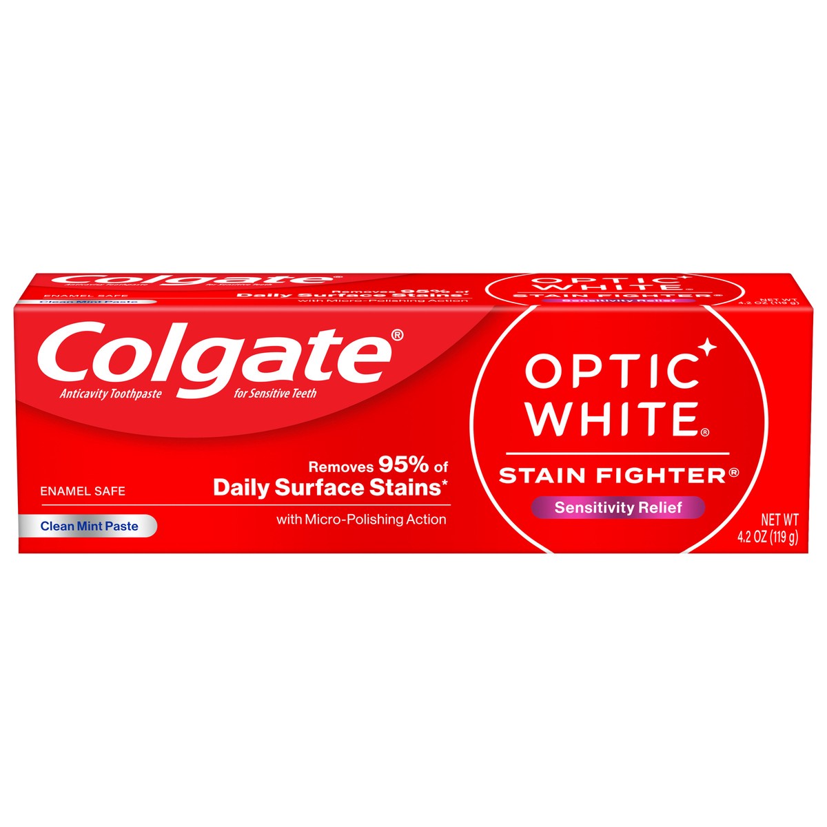 Colgate Optic White Stain Fighter Sensitivity Relief Teeth Whitening Toothpaste, 4.2 Oz. Remove every day surface stains to reveal a brighter smile with Colgate Optic White Stain Fighter Sensitivity R…