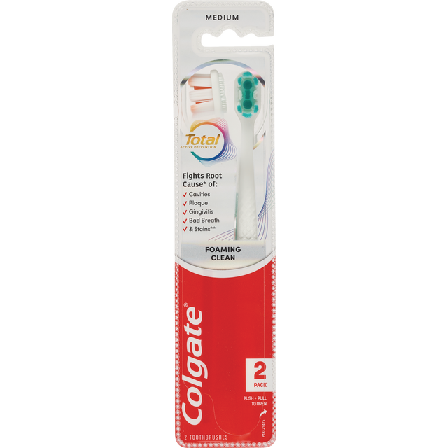Colgate Total Active Prevention Foaming Clean Medium Bristle Toothbrush is specially designed to tackle the root cause* cavities, plaque, gingivitis, bad breath, tartar buildup**, and stains***.*causeā¦