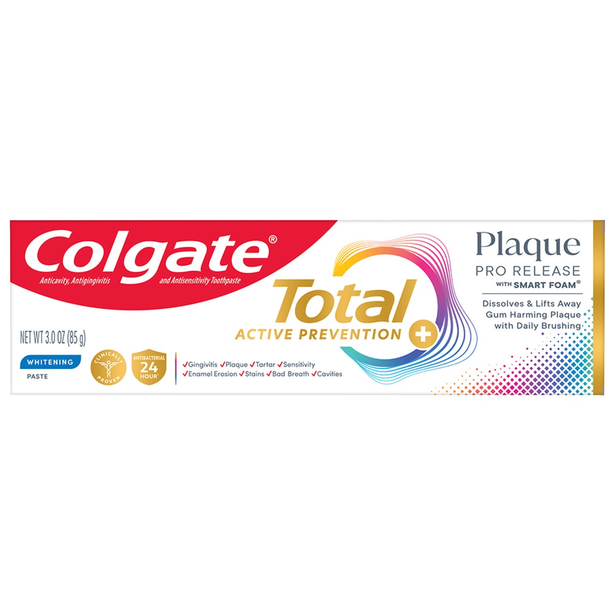 Dissolve and lift away gum harming plaque with daily brushing using Colgate Total Plaque Pro Release Whitening Toothpaste. The unique anticavity, antigingivitis, anti sensitivity toothpaste formula he…
