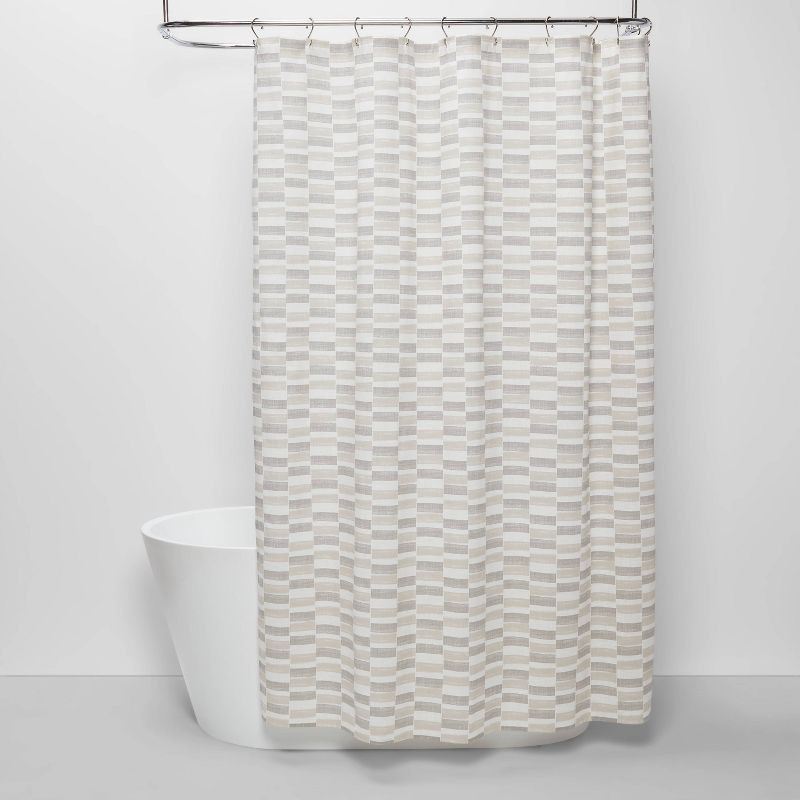 Fill your bath space with modern style by adding this Colorblock Shower Curtain from Threshold™. Showcasing a colorblock print in hues of gray and beige on a white background, this printed shower curt…