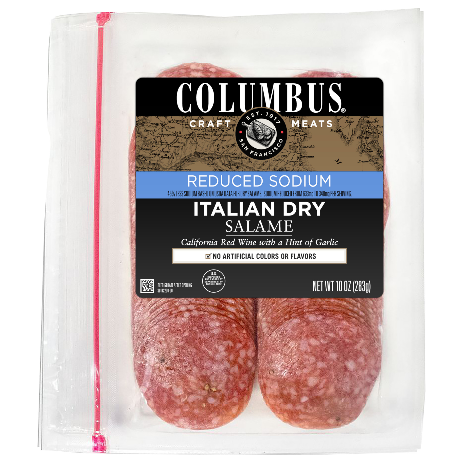 COLUMBUS Sliced Reduced Sodium Italian Dry Salame is made from select cuts of pork, cracked black pepper, burgundy wine and our signature blend of spices giving it a wonderful flavor. It is slow cured…