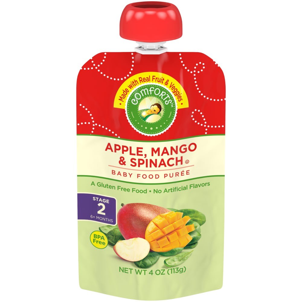Comforts™ Stage 2 Apple Mango and Spinach Baby Food Puree Pouch is made with real fruit and veggies. Your child will savor the delightful puréed blend of apple, mango, and spinach. Made for Stage 2 ba…