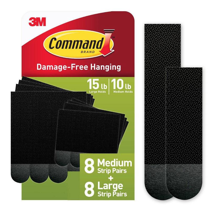 - DAMAGE-FREE PICTURE HANGERS: Includes 8 pairs (16 strips) of Black Command Large (15lb) and 8 pairs (16 strips) of White Command Medium (10lb) Picture Hanging Strips, unique hassle-free wall hangers for hanging pictures without nails or damage
