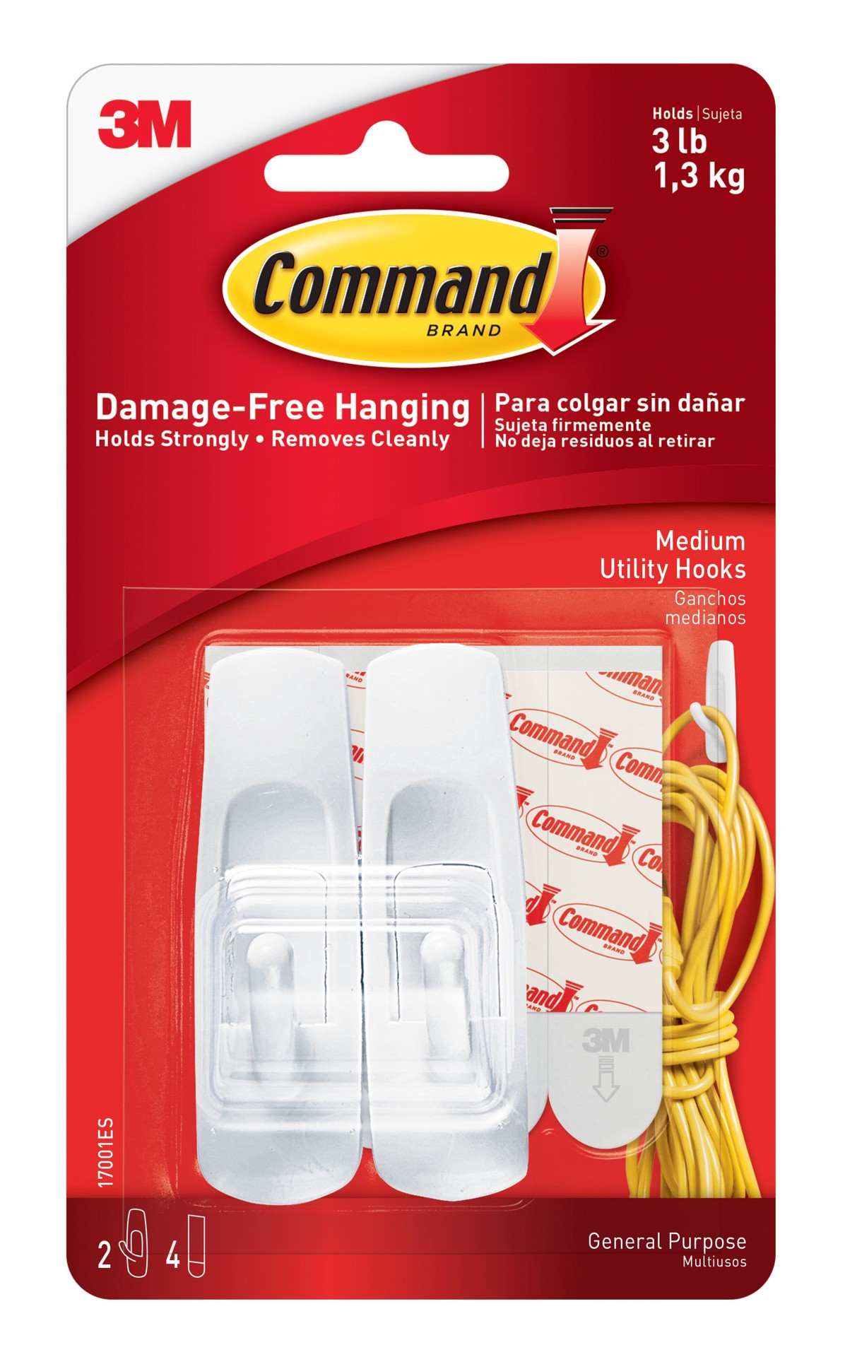 Holds up to 3 pounds: One package of the Command Medium Utility Hooks includes two wall hooks and four adhesive strips; each adhesive wall hook can hold up to three pounds. Works on a variety of smoot…
