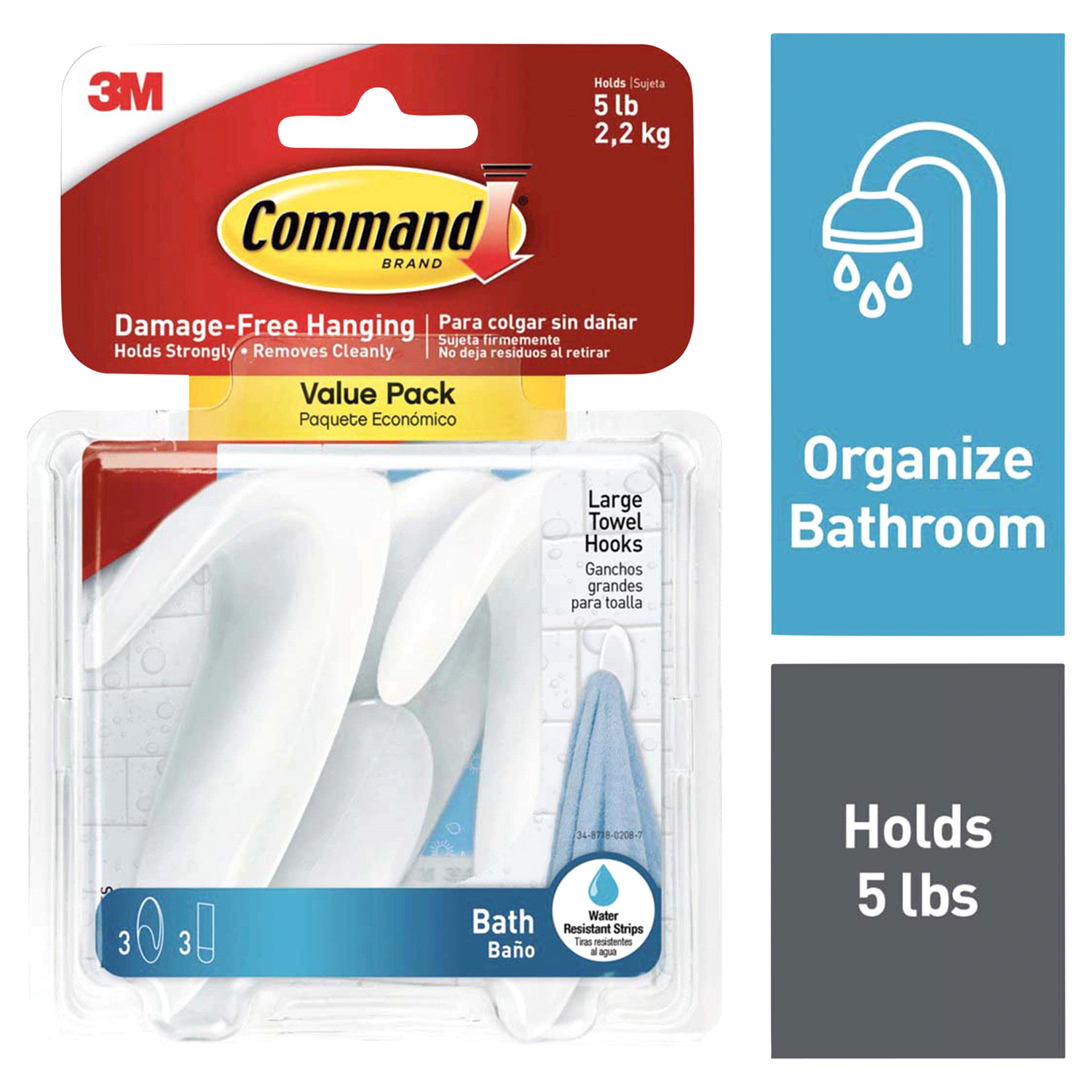 Command Large Towel Hook adheres to many surfaces, including glass, mirror, tile, fiberglass, wood and painted surfaces. It is easy to apply and comes off leaving no holes, marks, sticky residue or st…