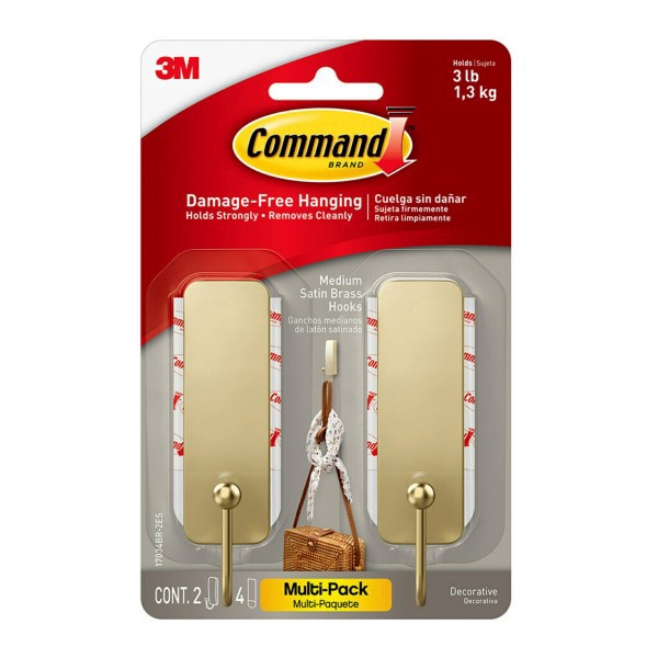Command Medium Satin Brass Hooks, 3 Lb, 2 Medium Hooks, 4 Medium Strips