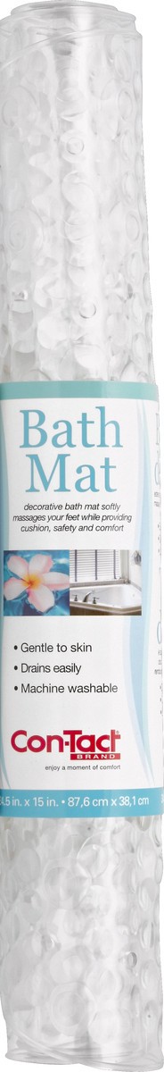 34.5 in x 15 in. Decorative bath mat softly massages your feet while providing cushion, safety and comfort. Gentle to skin. Drains easily. Machine washable. Enjoy a moment of comfort. Made in China.