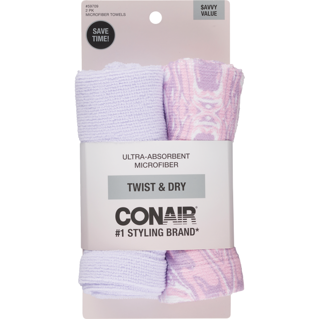 Conair has everything you need for beautiful hair. These super-soft microfiber towels bring the spa home, pampering you with style. Designed with a convenient hood, loop, and button closure, they effo…