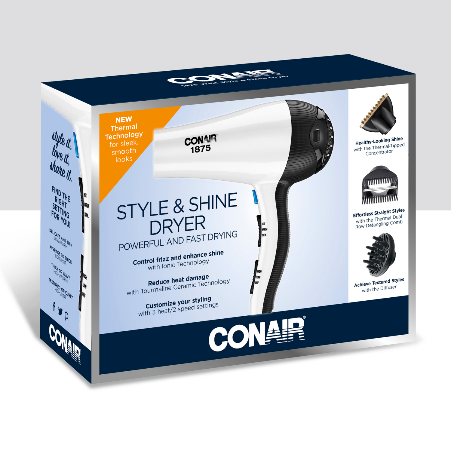 Our thermal shine styler is equipped with everything you need to achieve a beautiful, voluminous hairstyle fast. This powerful hair dryer features ionic conditioning and Ceramic Technology to help eliā¦