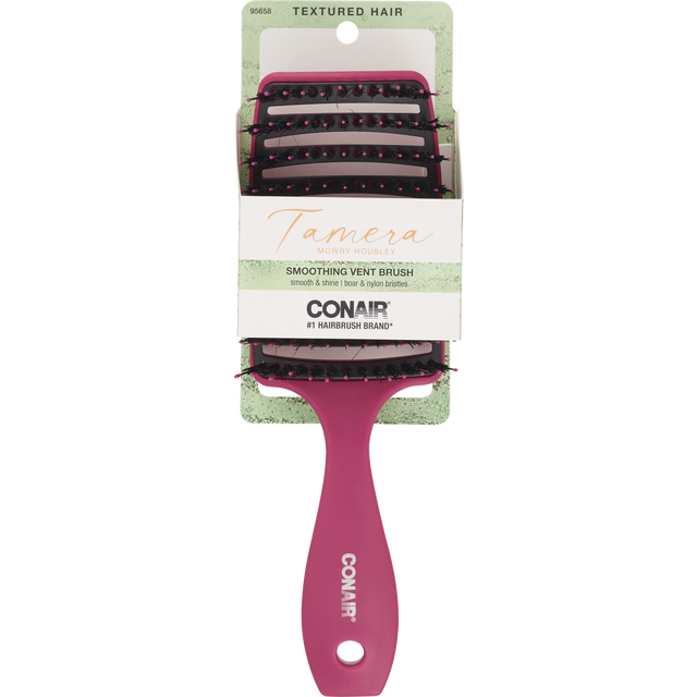 Perfect for textured hair, the Tamera Mowry Housley x Conair Smoothing Vent Brush features a vented back that reduces excess moisture when detangling wet hair. The concave shape lifts hair at the roo…