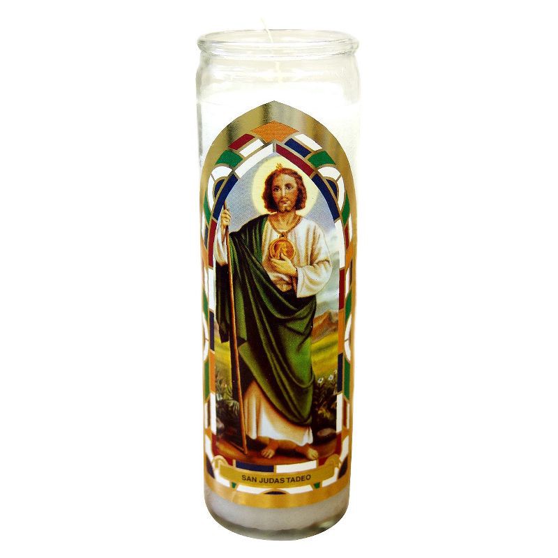 - Authentic religious cathedral candles featuring a copyrighted stained-glass window design