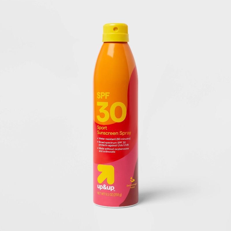Safely enjoy sunny days outdoors using this Sport Sunscreen Spray - SPF 30 from up&up™. Dermatologist-tested, this scented broad-spectrum sunscreen blocks harmful UVA and UVB rays. Plus, it's water-re…