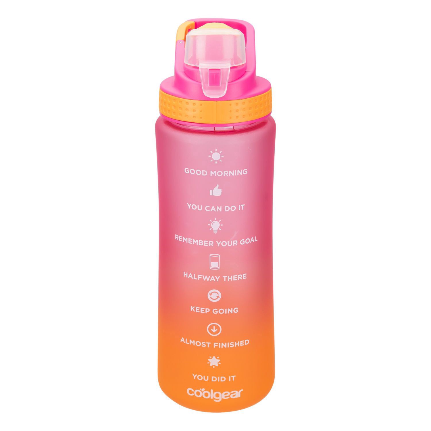 Drink in style with this motivational soft-touch ombre bottle. Inspirational measurement lines motivate you to stay hydrated. The built-in carabineer ensures your bottle can go with you anywhere!