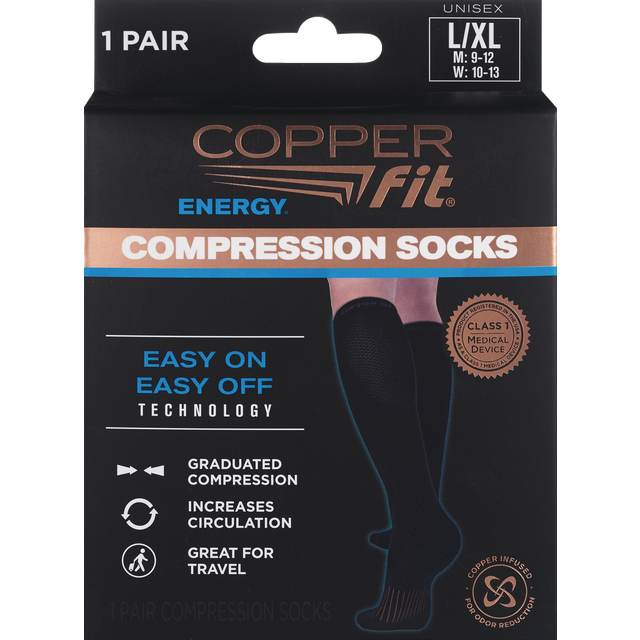 Gently support your arches, feet, and calves with these size L/XL Copper Fit Energy Compression Socks. Designed to provide energizing support for improved foot and leg comfort, performance and enduran…