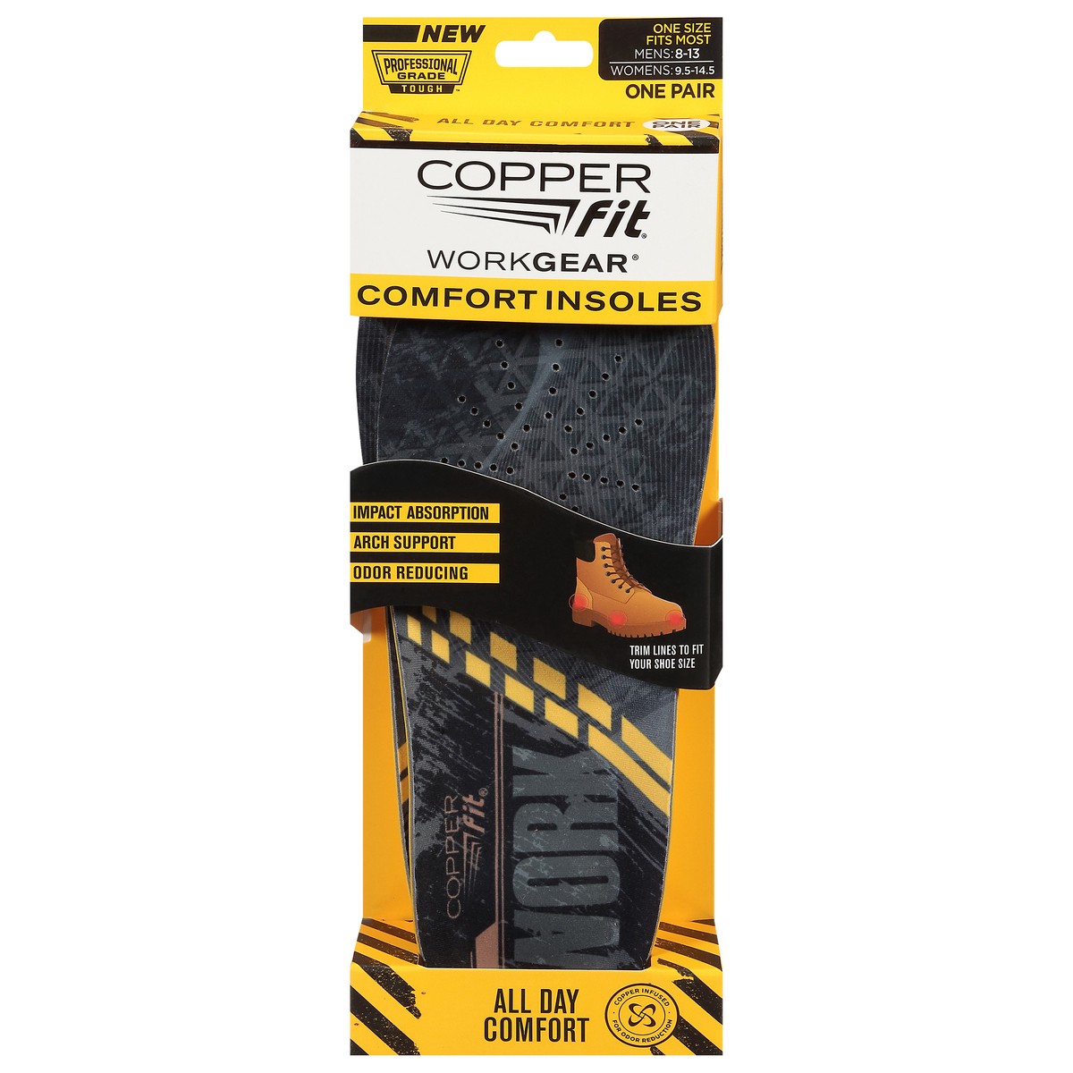 New. Professional grade tough. Work gear comfort insoles. Impact absorption. Arch support. Odor reducing. All day comfort. Copper fit work gear allows you to tackle the most demanding of jobs. Work ge…