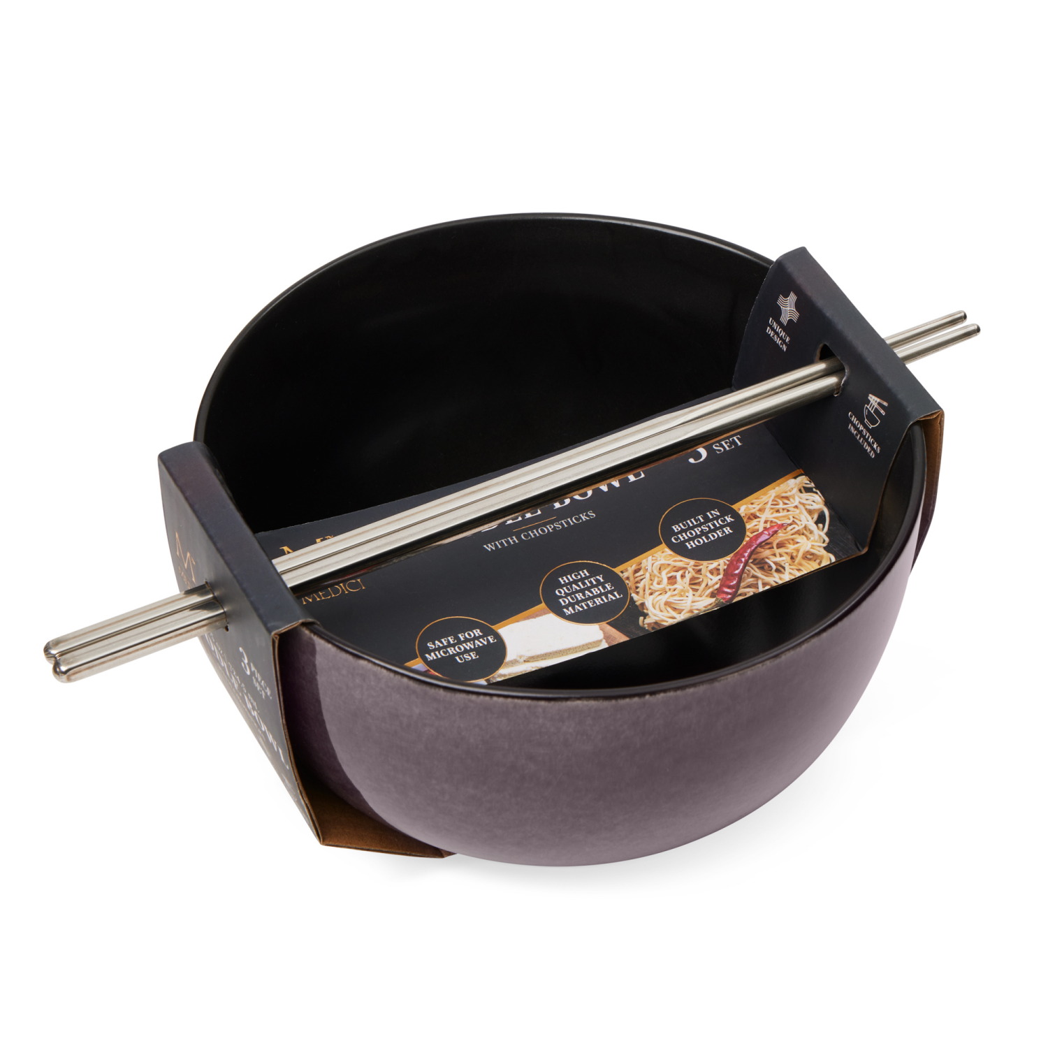 Ceramic ramen bowl great for noodles, soups and more. Includes stainless steel chopsticks and built in chopstick holder.