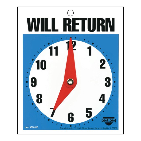 Easy to read sign features Open and will return time. Sign reads ''Open Come In'' on 1-side to welcome customers. The other side has ''Will Return'' with a clock to indicate your return time. Durable …