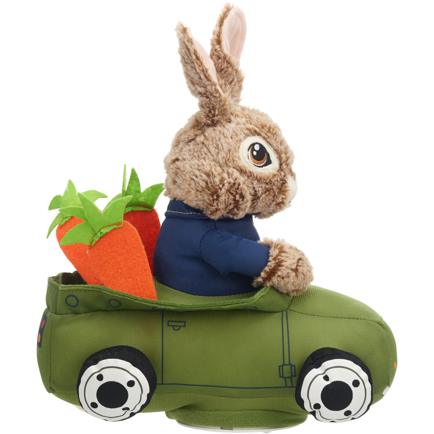This adorable 9.5" animated plush Peter Rabbit dances around in his little carrot car. Peter is dressed in his signature blue jacket. Durable construction Makes a great gift Super soft plush material