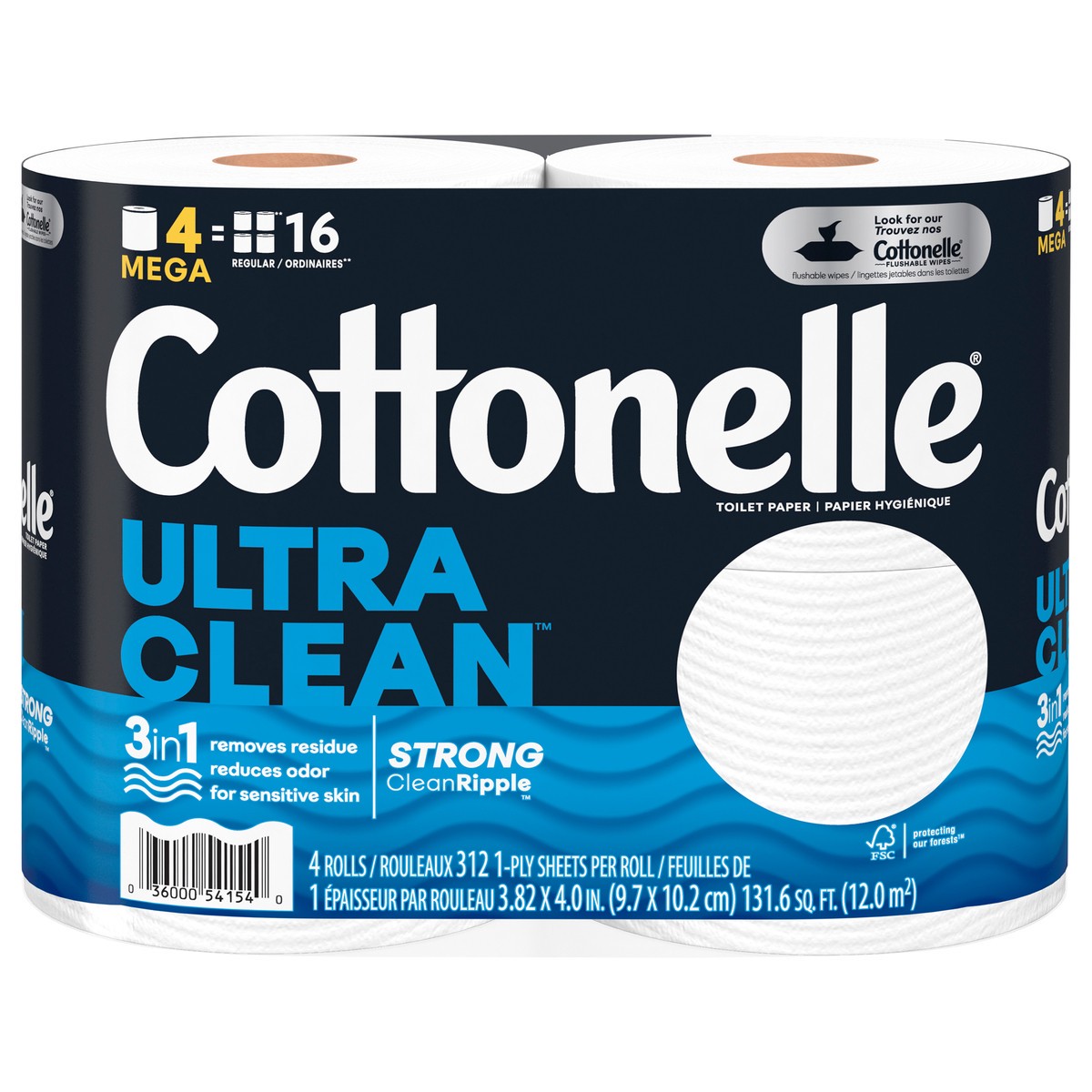 Cottonelle Ultra Clean Toilet Paper, Strong Toilet Tissue, 4 Mega Rolls (4 Mega Rolls = 16 Regular Rolls), 312 Sheets per Roll