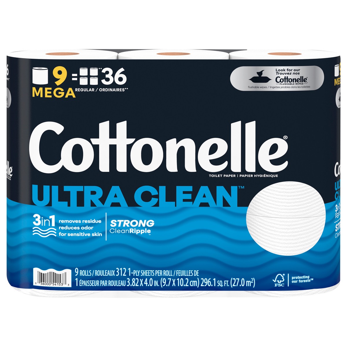 Cottonelle Ultra Clean Toilet Paper, Strong Toilet Tissue, 9 Mega Rolls (9 Mega Rolls = 36 Regular Rolls), 312 Sheets per Roll
