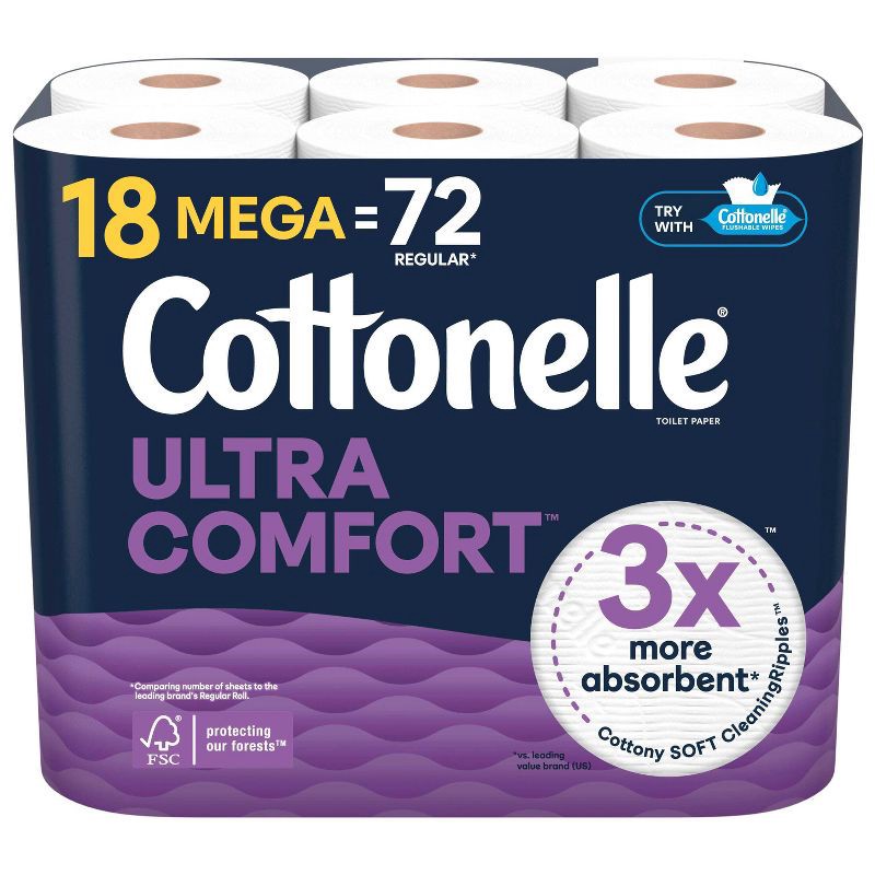 - WHAT'S INCLUDED — This toilet paper pack includes 18 Mega Rolls of Cottonelle Ultra Comfort 2-Ply Toilet Paper with 244 sheets per roll (462.60 square feet total); packaging may vary
