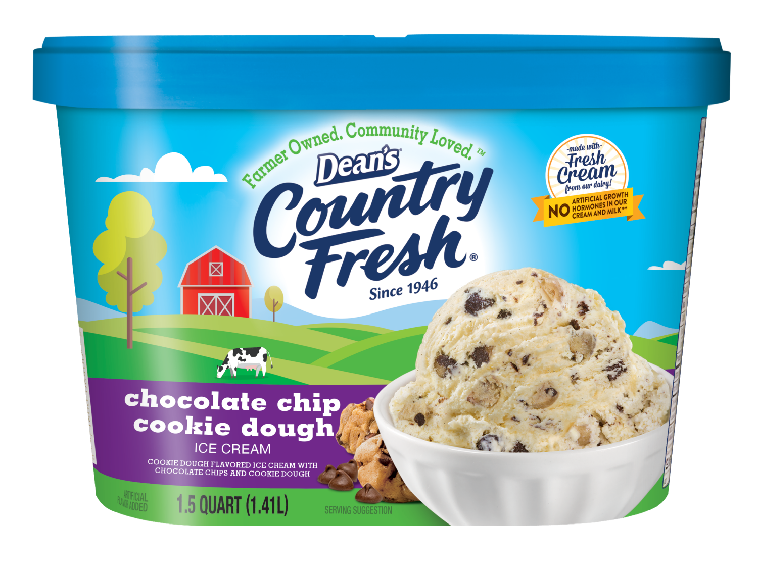 Cookie dough flavored ice cream with chocolate chips and cookie dough. Artificial flavor added. Made with fresh cream from our dairy! No artificial growth hormones in our cream and milk (Our farmers p…