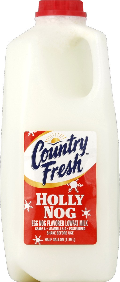 Egg nog flavored lowfat milk. Grade A. Vitamin A & D. Pasteurized.