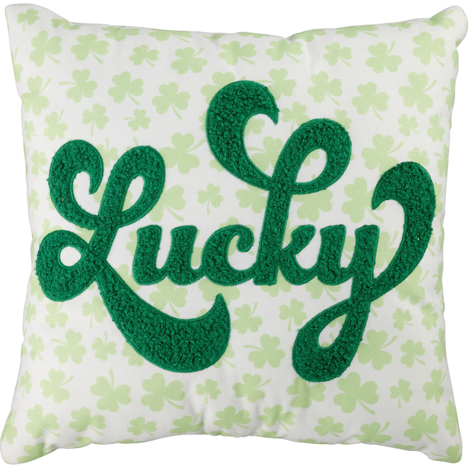 A green shamrock pillow with "Lucky" brings a charming touch to any home, especially during St. Patrick's Day. Its warm and whimsical design makes it suitable for year-round display, adding a bit of l…