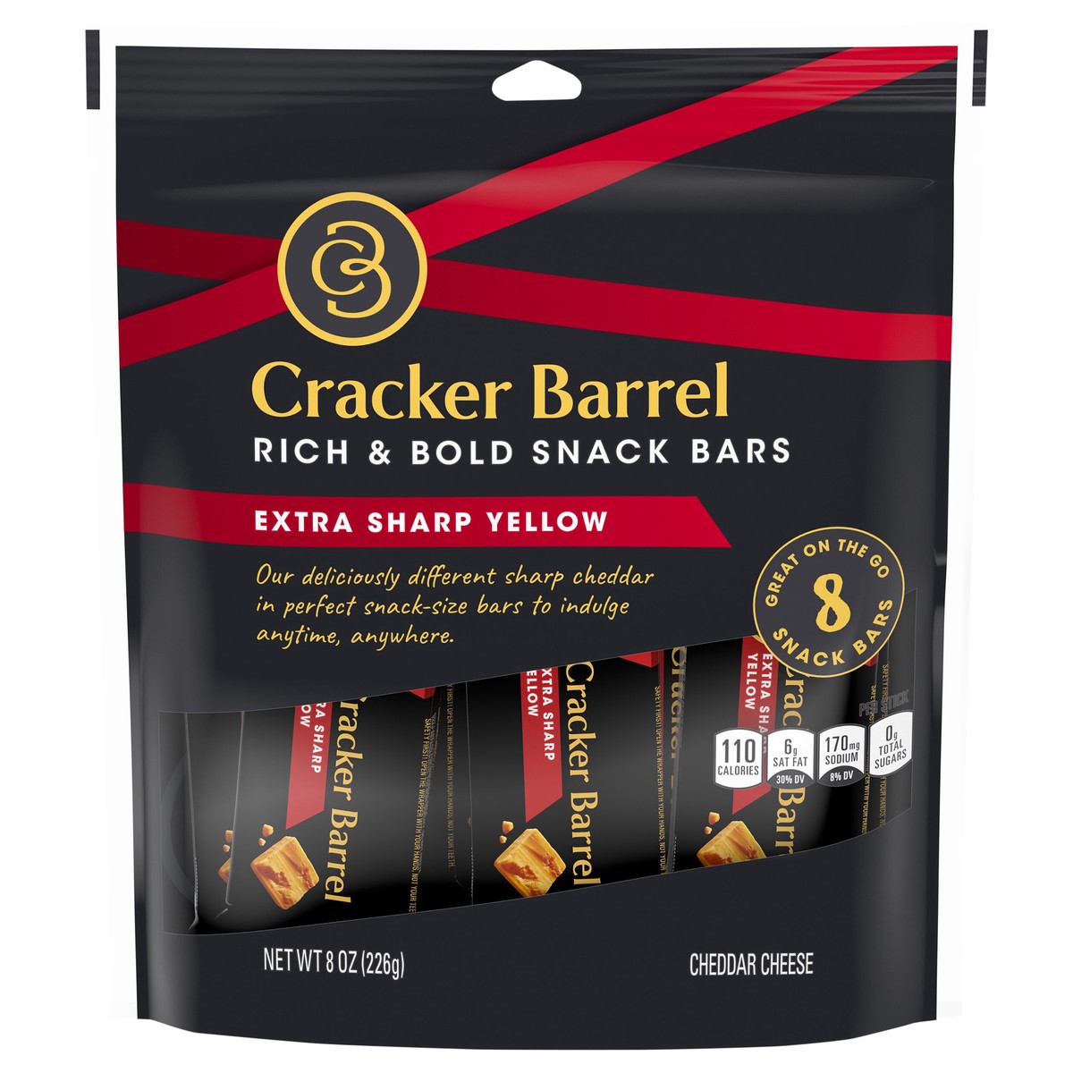 Cracker Barrel Rich & Bold Extra Sharp Yellow Cheddar Cheese Snack Bars are a deliciously different cheddar snack. Packaged as a convenient, grab-and-go snack, stock up with this 8 ounce pack. How doe…