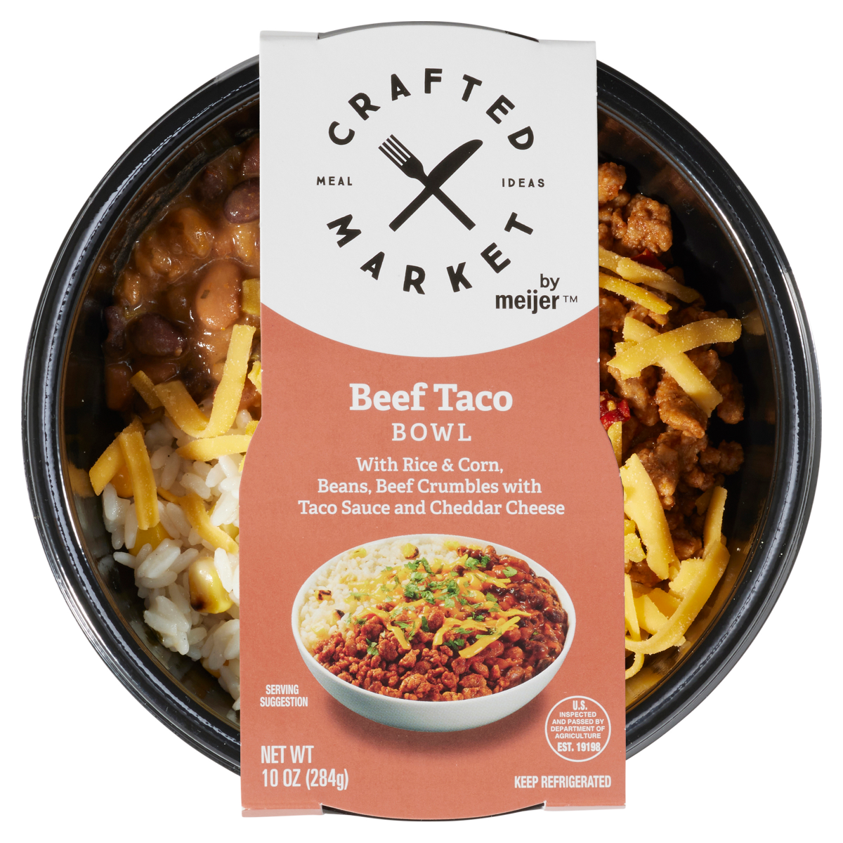 CRAFTED MARKET BEEF TACO BOWL 10 OZ Rice & corn, beans, beef crumbles with taco sauce and cheddar cheese.