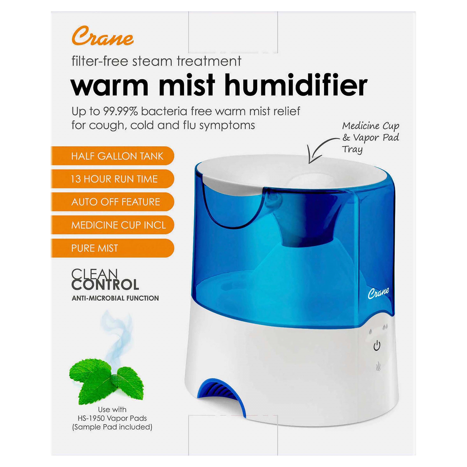 Filter-free steam treatment. Up to 99.99% bacteria free warm mist relief for cough, cold and flu symptoms. Medicine cup & vapor pad tray. Half gallon tank. 13 hours run time. Auto off feature. Medicin…