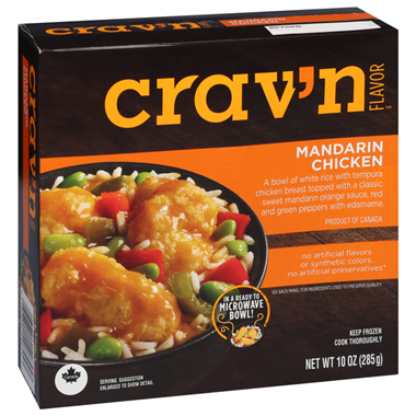 A bowl of white rice with tempura chicken breast topped with a classic sweet mandarin orange sauce, red and green peppers with edamame. No artificial flavors or synthetic colors, no artificial preserv…