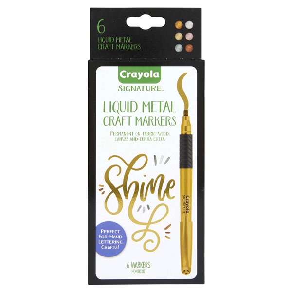 Crayola Signature Liquid Metal Permanent Art Markers add an extra sleek sheen to school projects, hand lettering, homemade cards, crafts, and other colorful art projects. Works great on poster board, …