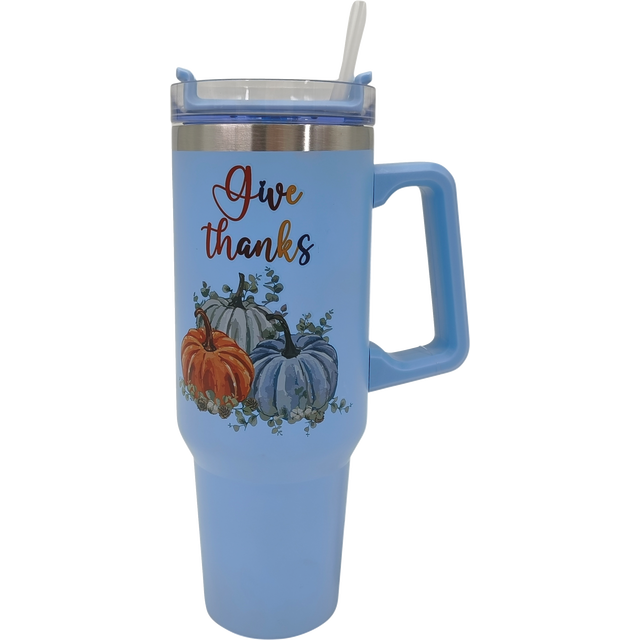 "Give Thanks" 30-ounce travel mug with straw, adorned with charming fall decorations and pumpkins. Perfect for enjoying your favorite beverages on-the-go during the autumn season.