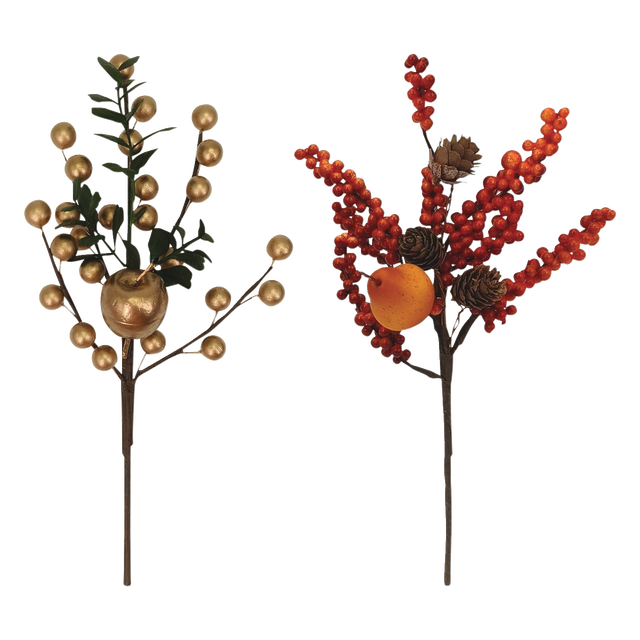 12-inch Harvest Fall Leaves Flower Pick. Lifelike fruit accents add a touch of seasonal charm.