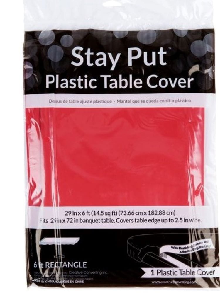 This Red Stay Put Table Cover will provide an eye-catching setting at your upcoming event. The plastic table covering measures 29" x 72” and features elastic around it’s edges to keep it held firmly i…