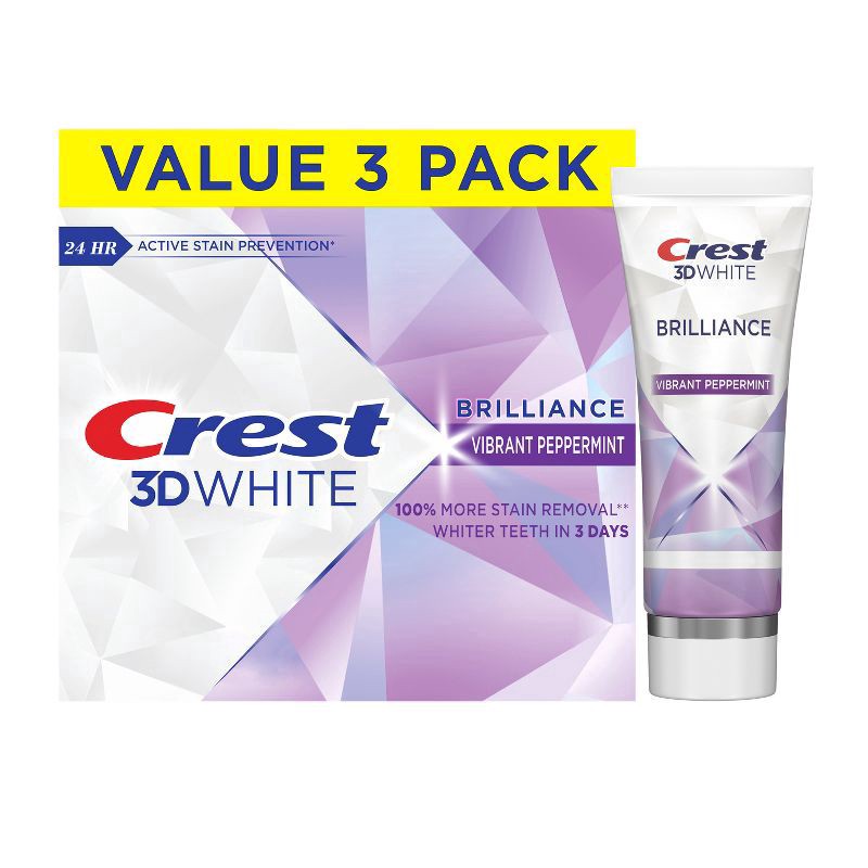 Our Most Advanced* 3D White toothpaste yet. Crest 3D White Brilliance toothpaste whitens teeth by removing 100% more surface stains in 3 days, with 24-hour stain protection when paired with twice dail…