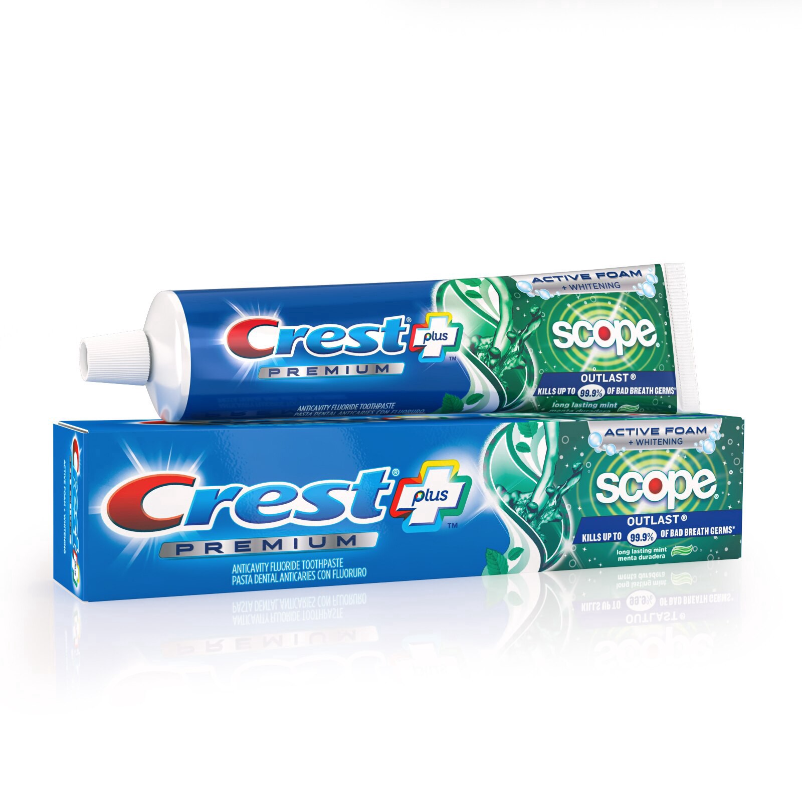 Crest Premium Plus Scope Outlast toothpaste uses an Active Foam + Whitening formula that helps fight cavities and tartar all while working to remove surface stains. Kills up to 99.9% of bad breath ger…