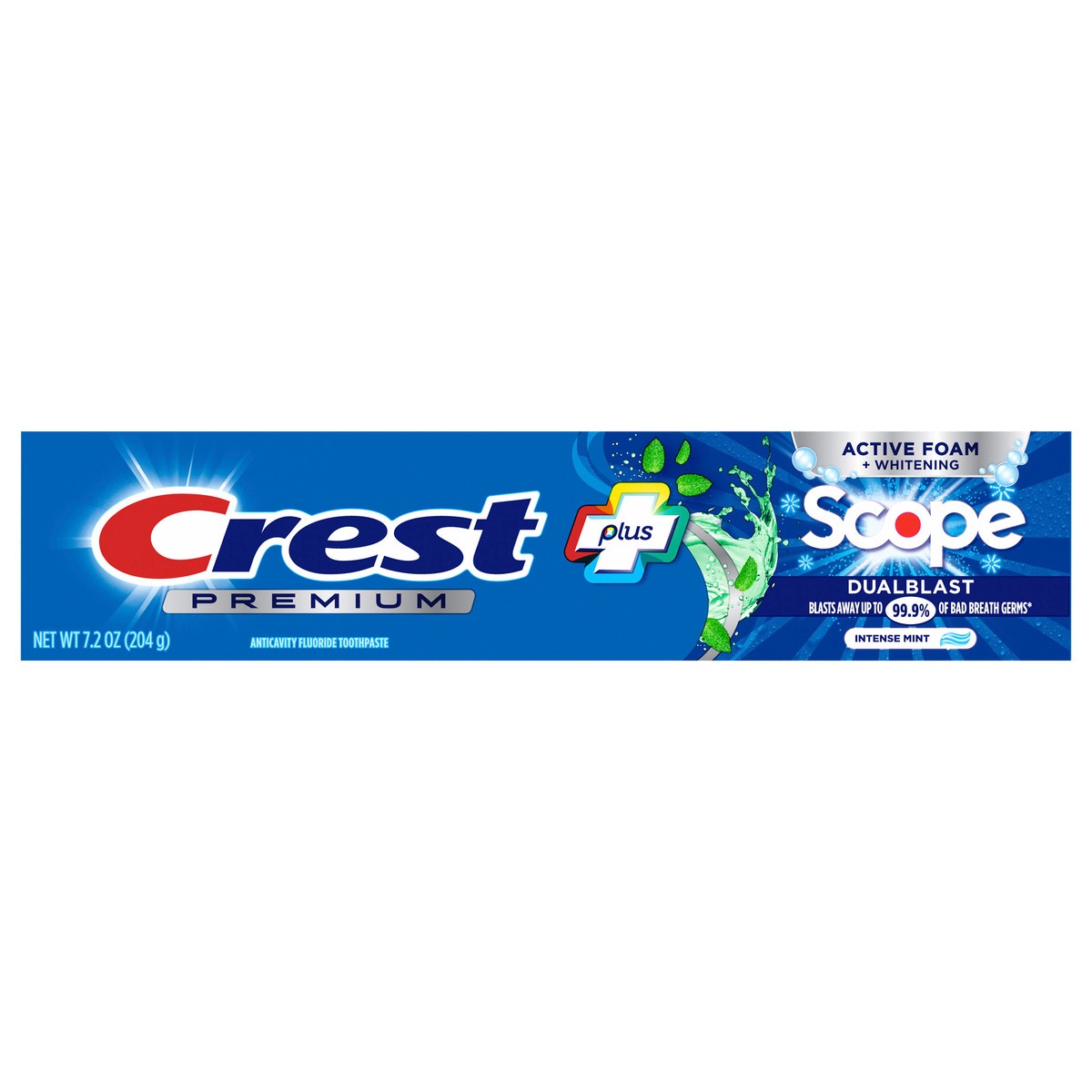 Crest Premium Plus Scope Dual Blast toothpaste blasts away up to 99.9% of bad breath germs. The Crest Premium Plus line features an Active Foam + Whitening formula that removes surface stains while fi…