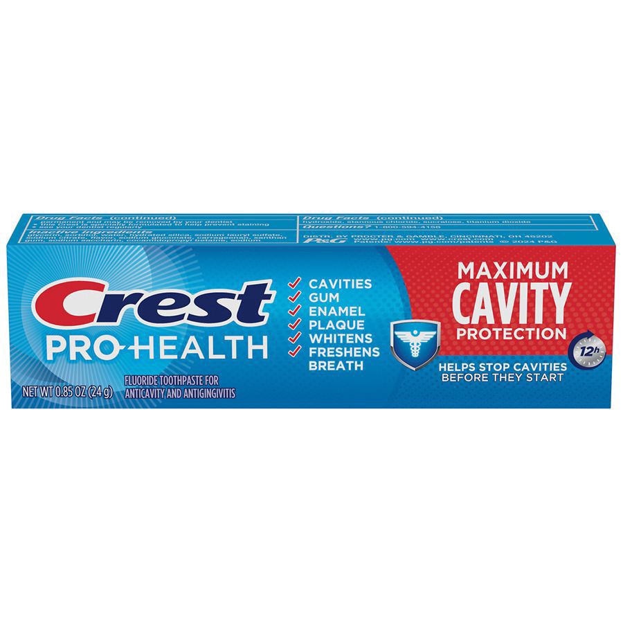 Crest Pro-Health Maximum Cavity Protection stops cavities before they start. Most toothpastes quit working in minutes, but the antibacterial fluoride in Crest Pro-Health protects for up to 12 hours. C…