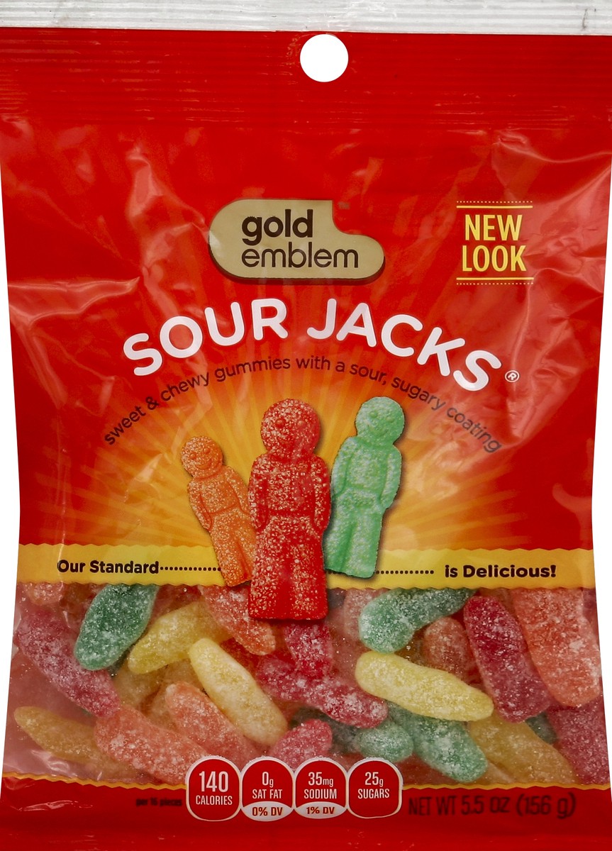 Sweet & chewy gummies with a sour, sugary coating. New look. Our standard is delicious! Per 16 Pieces: 140 calories; 0 g sat fat (0% DV); 35 mg sodium (1% DV); 25 g sugars. Gold Emblem Sour Jacks is a…