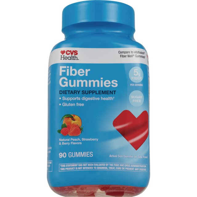 Fiber gummies. Natural peach, strawberry, and berry flavors. Gluten free. CVS Health quality. 90-count. Support your body's digestive health* with CVS Health Fiber Gummies. These delicious gummies con…