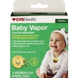 3 Months + -- CLIP-ON VAPORIZER -- Soothes stuffy noses with menthol and eucalyptus -- Clip onto clothes for soothing vapors. With convenient pacifier attachment. Safe & easy to use. UP TO 12 HOURS --…